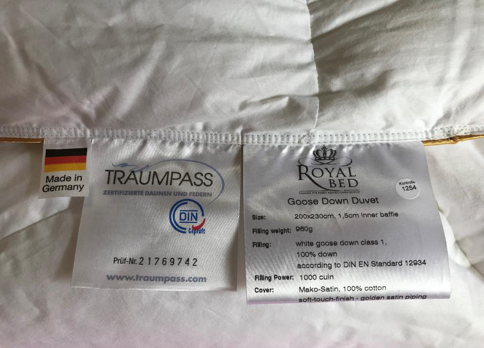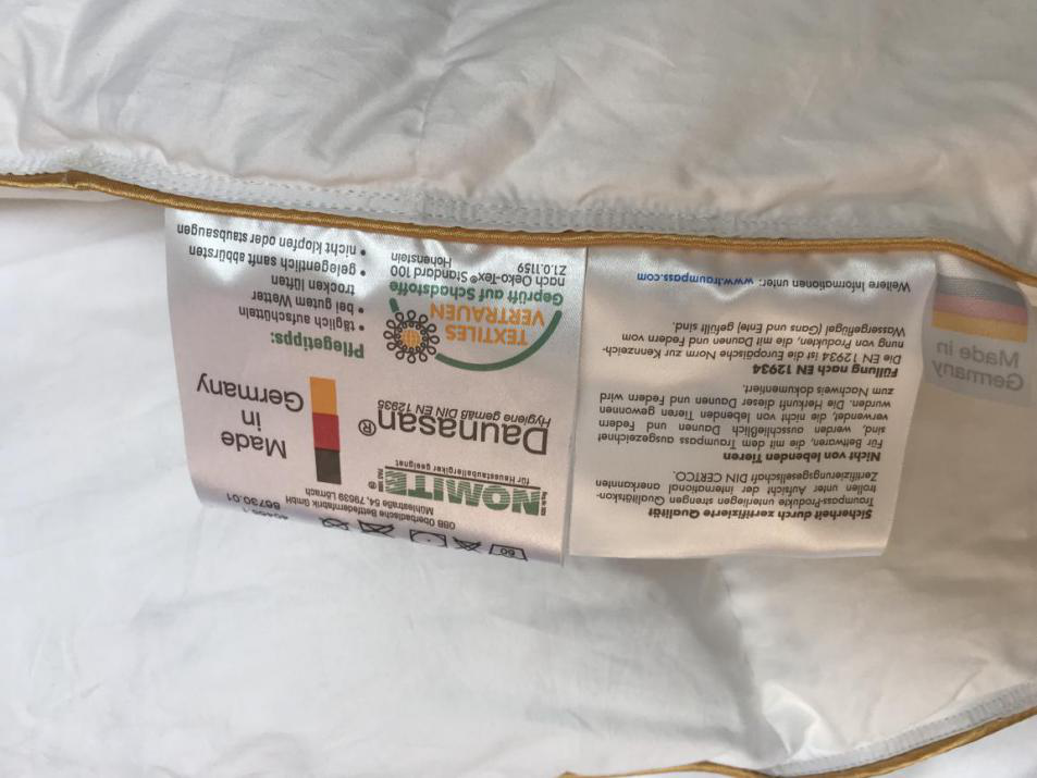 经核实Traumpass是欧洲羽绒羽毛质量,表示产品符合欧洲头等填料标准DIN EN12934,且不使用活拔羽绒;NOMITE是欧洲防尘螨过敏技术认证,表示尘螨过敏者可以放心使用;Öko-Test是全球纺织品安全资质认证,是国际通用的纺织品权威认证,每种获得此项认证的产品都有唯一对应的编码,根据编码查到这被子是I类3岁以下婴幼儿产品……