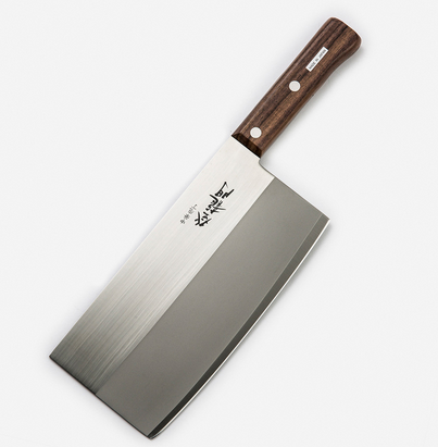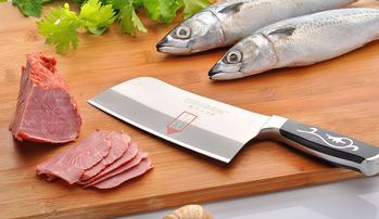菜刀:菜刀也叫中片刀是最常用的中式刀具,适用于切肉、鱼、禽类食物及蔬菜的切片、切丝等,它的刀片相对于分刀比较大,重量也较重,刀刃处的锋利程度加上它刀本身自重,比较适合男士上下直刀使用,在选购菜刀时最好选择刃口平直的,平直的刃口在使用时磨、切用都会比较方便。