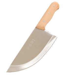 砍刀:砍刀又叫剁刀,用于砍剁鸡、鸭骨架,以及猪肋骨等,适用于切剁各类带骨肉制品,由于砍刀的用途所以它的钢质要比一般刀的材质稳定,有厚重感,重量也是烹饪刀中最重的,尤其在刀刃处的材质钢质会较优质,它的刀刃比起菜刀、分刀虽不够锋利但它自身的重量和砍、剁的使用方式,在处理带骨肉质是最合适的。