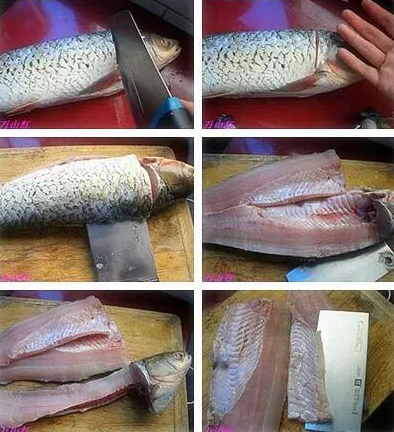 1、先把整块的鱼肉片切下来:鱼头下面横切一刀,先从鱼皮下面挑出鱼线,这条线很腥,然后沿鱼骨处下刀,切下一半的鱼肉,两边一样的切法,就把整片的鱼肉切下来了。然后沿鱼刺方向再把刺去掉,就得到完好的两片鱼肉了。