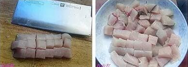 3、切丁:选厚度适宜位置,切下来一块,然后依据需求大小,垂直下刀切丁,鱼丁能够单独做,也能够和其它的丁搭配做菜。