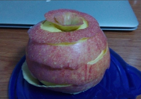 一条完整的不断的苹果皮削好是可以重新盖上整个苹果的。一把成就感涌上心头,这个时候是不是觉得削苹果的技术还是相当不错的。